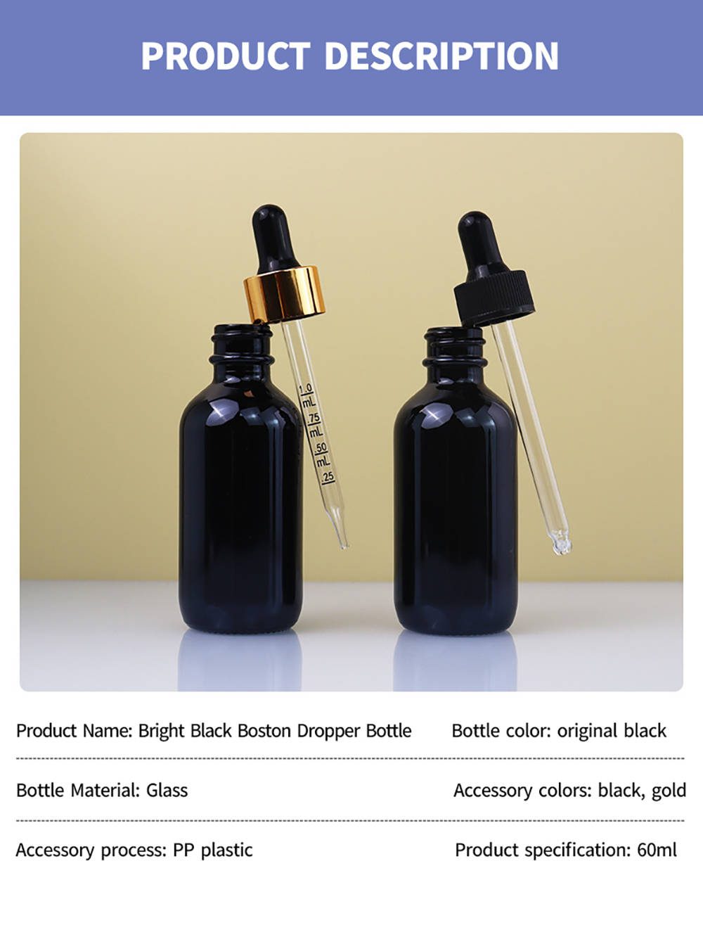 | Label Process Craft | UV electroplating, transparent, spraying with pearlescent effect, spraying semi-transparent, frosting + silk screen printing, frosting + gold stamping, frosting + silver stamping, spraying + silk screen printing. | ||||